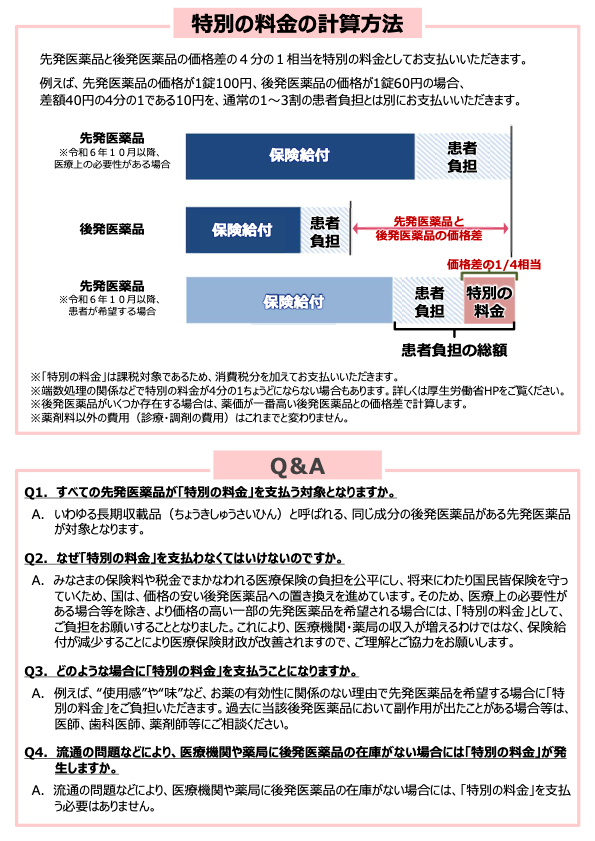 後発医薬品のある先発医薬品(長期収載品)の選定療養について 2024年10月1日 最終更新日時 : 2026年1月8日 wakugumi 後発医薬品(ジェネリック医薬品)があるお薬で、先発医薬品の処方を希望される場合は、特別の料金をお支払いいただきます。この機会に、後発医薬品の積極的な利用をお願いいたします。 詳細について 厚生労働省HPをご覧下さい 厚生労働省HP 後発医薬品のある先発医薬品(長期収載品)の選定療養について FacebookXCopy